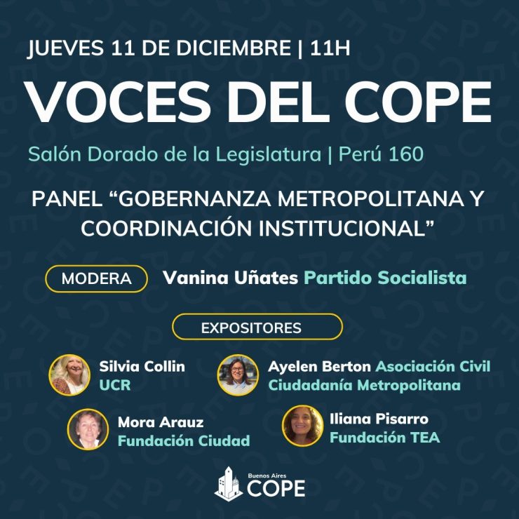El pasado 11 de diciembre tuvo lugar la segunda Asamblea anual del Consejo de Planeamiento Estratégico de la Ciudad de Buenos Aires, ocasión en la que se desarrolló el evento “Voces del CoPE”, destinado a exponer la mirada y los trabajos de las organizaciones integrantes, en este caso centrado en la problemática metropolitana.